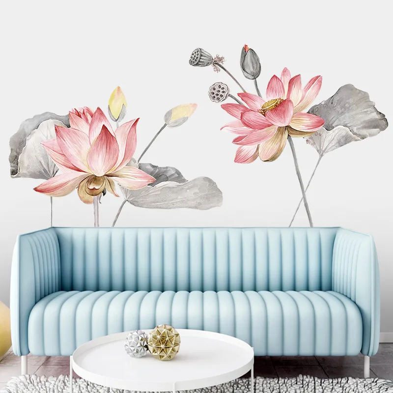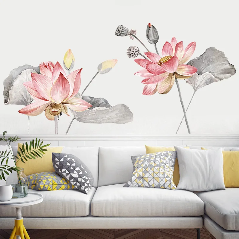 Comprar Pegatina de pared de vinilo estilo chino flor de loto póster Vintage dormitorio de baño decoración del hogar calcomanías Stikers Mural Online Baratos
